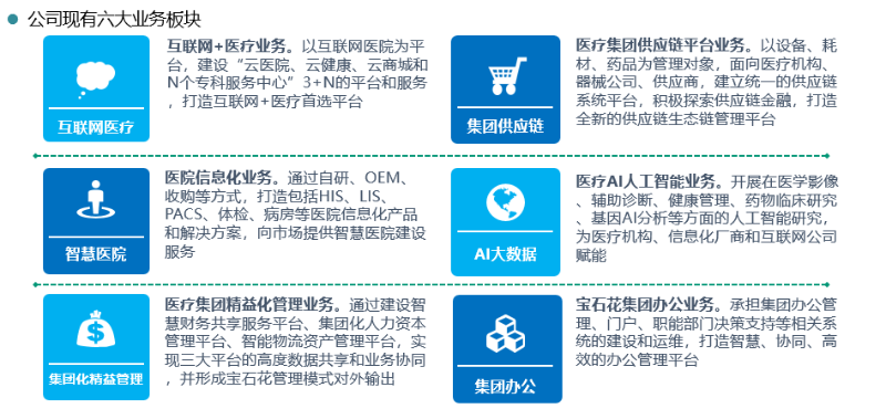 主要业务板块包括互联网医疗、智慧医院、集团化管理、AI大数据等6个业务版块,专注医疗信息化产品及新技术的研发和应用,依托宝石花庞大的医院体系,打造医疗信息化产品和服务能力,发展宝石花信息化产业。